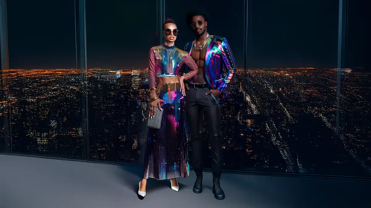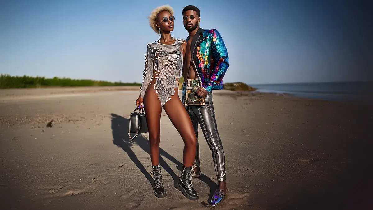 Bold accessories: Add futuristic accessories like mirrored sunglasses, metallic jewelry, and high-tech watches that align with the glitch theme.