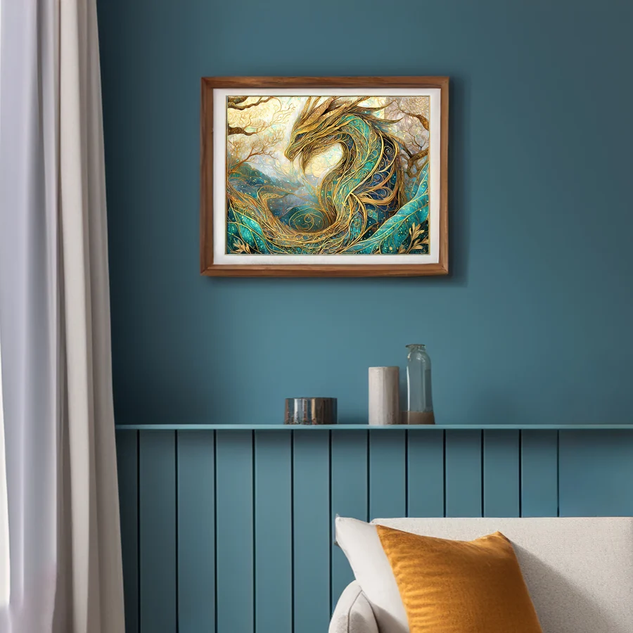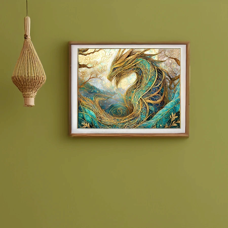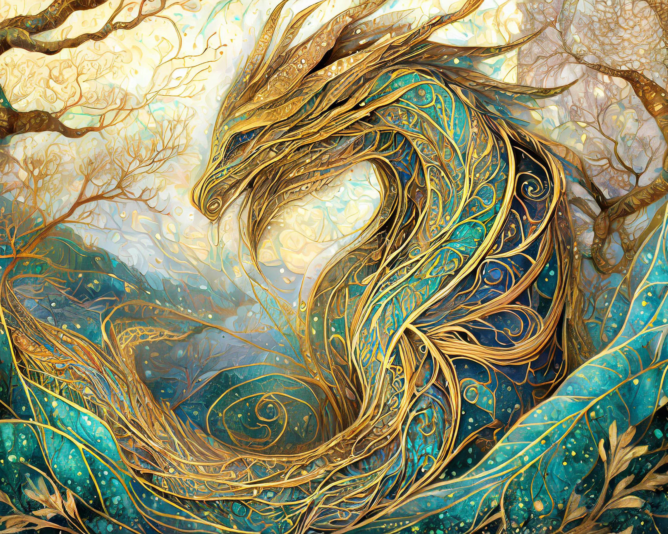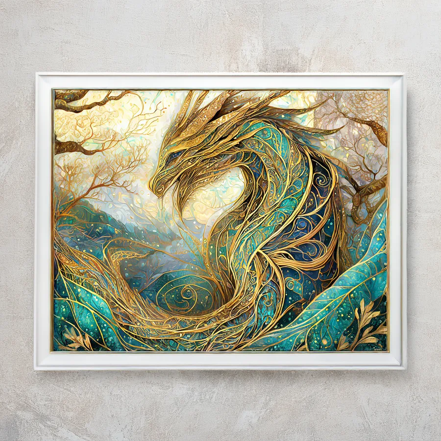 A majestic golden dragon coils through swirling turquoise mists, its serpentine form rippling with ethereal energy that practically radiates off the canvas. This breathtaking fusion of Studio Ghibli's whimsy and Game of Thrones' epic grandeur creates a mystical aesthetic that somehow manages to be both serene and absolutely metal at the same time. Look, if you're trying to zhuzh up your meditation space while also letting everyone know you're totally that person who names their houseplants after fantasy characters, this divine beast is absolutely your jam.