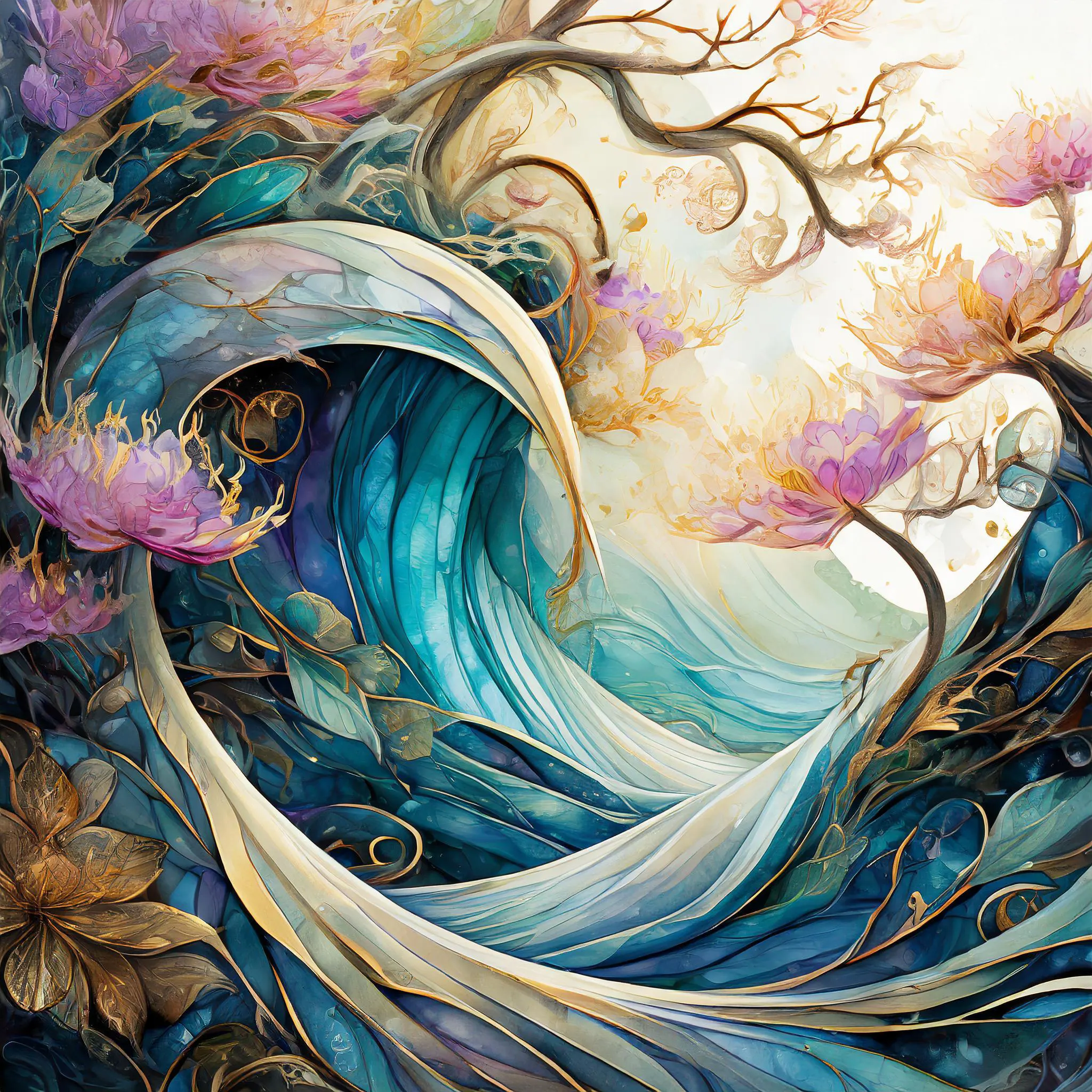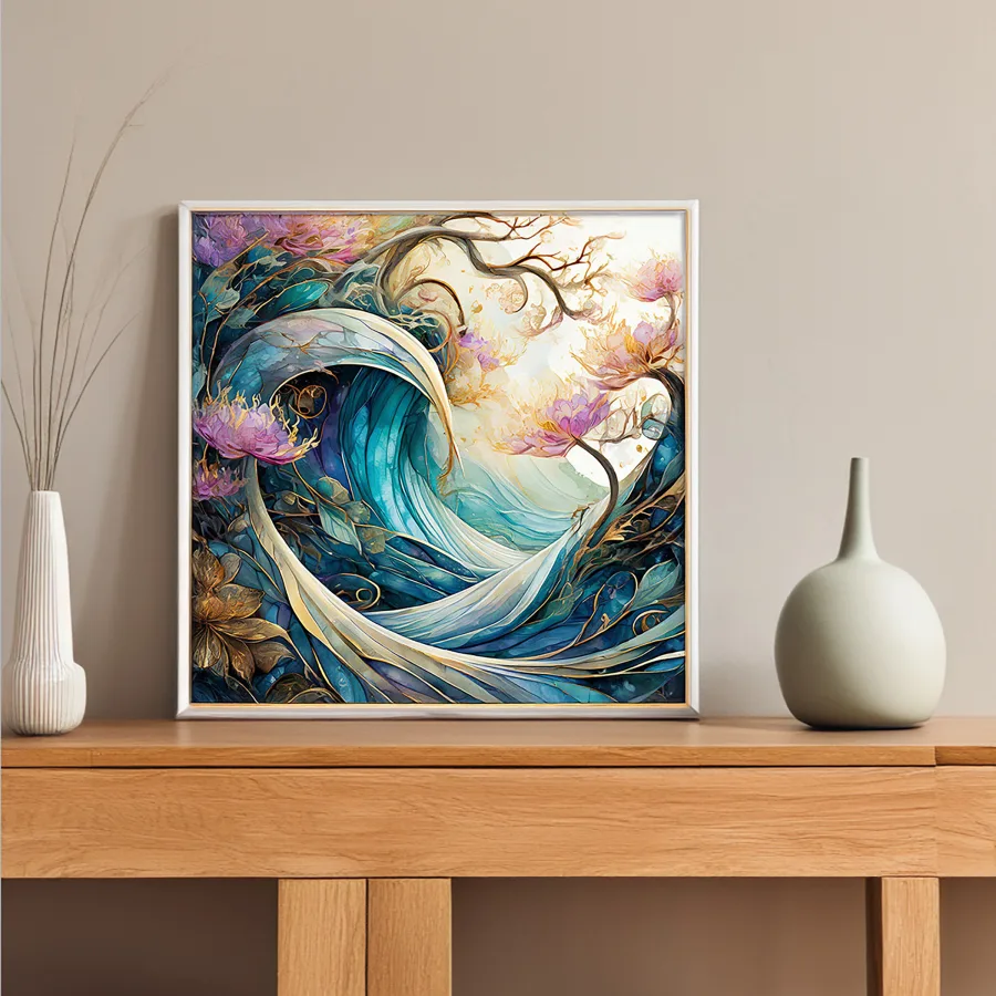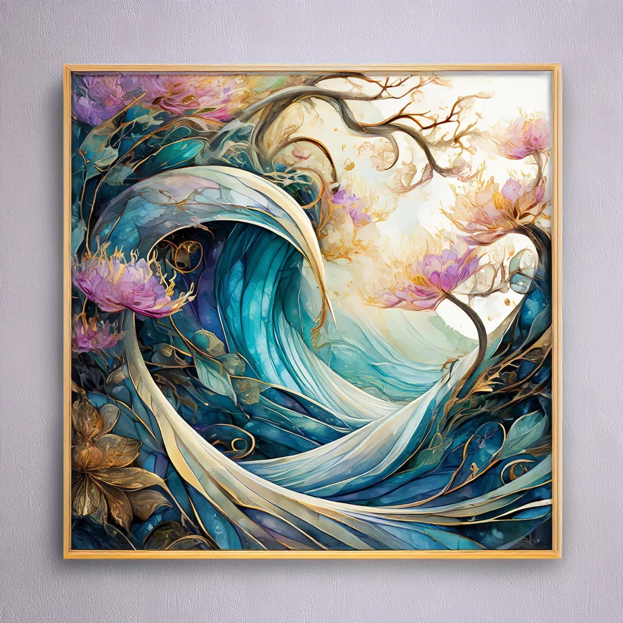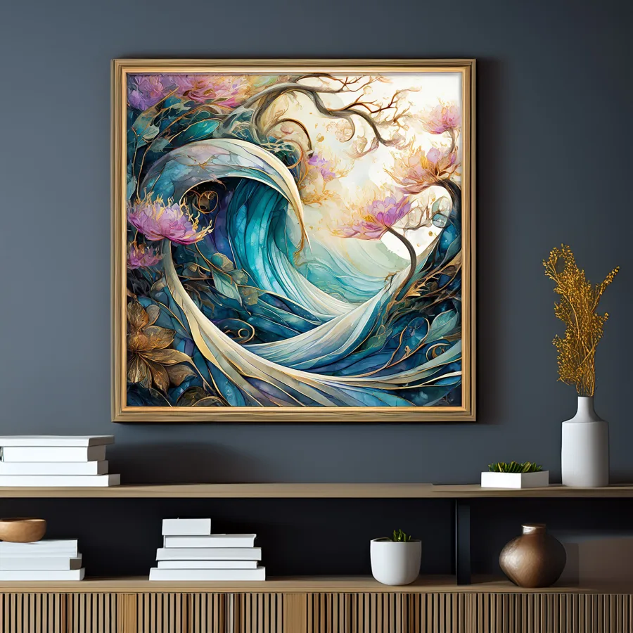 The majestic wave seems to defy gravity itself, hovering between reality and dreams as it spirals outward in a dance of turquoise and liquid gold. Traditional Japanese wave aesthetics get a fantastical makeover here, with ethereal cherry blossoms and lotus motifs swirling through the supernatural spray in a way Hokusai never imagined but probably would've vibed with. Listen, if you're trying to create a meditation space that makes people actually want to om their way to enlightenment instead of scrolling TikTok, this is your ticket to zen mastery.