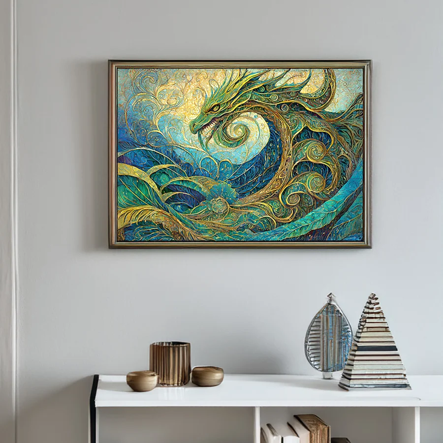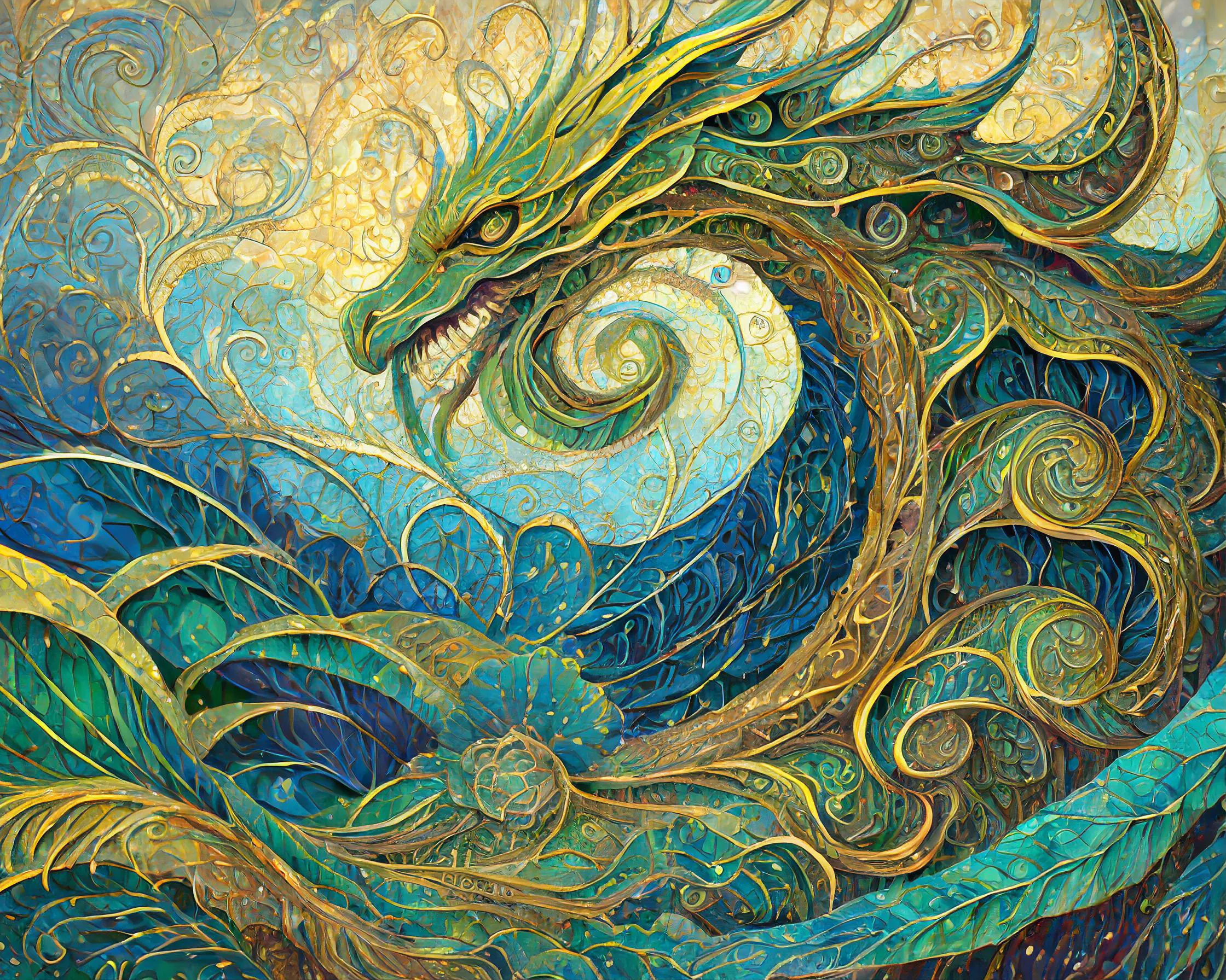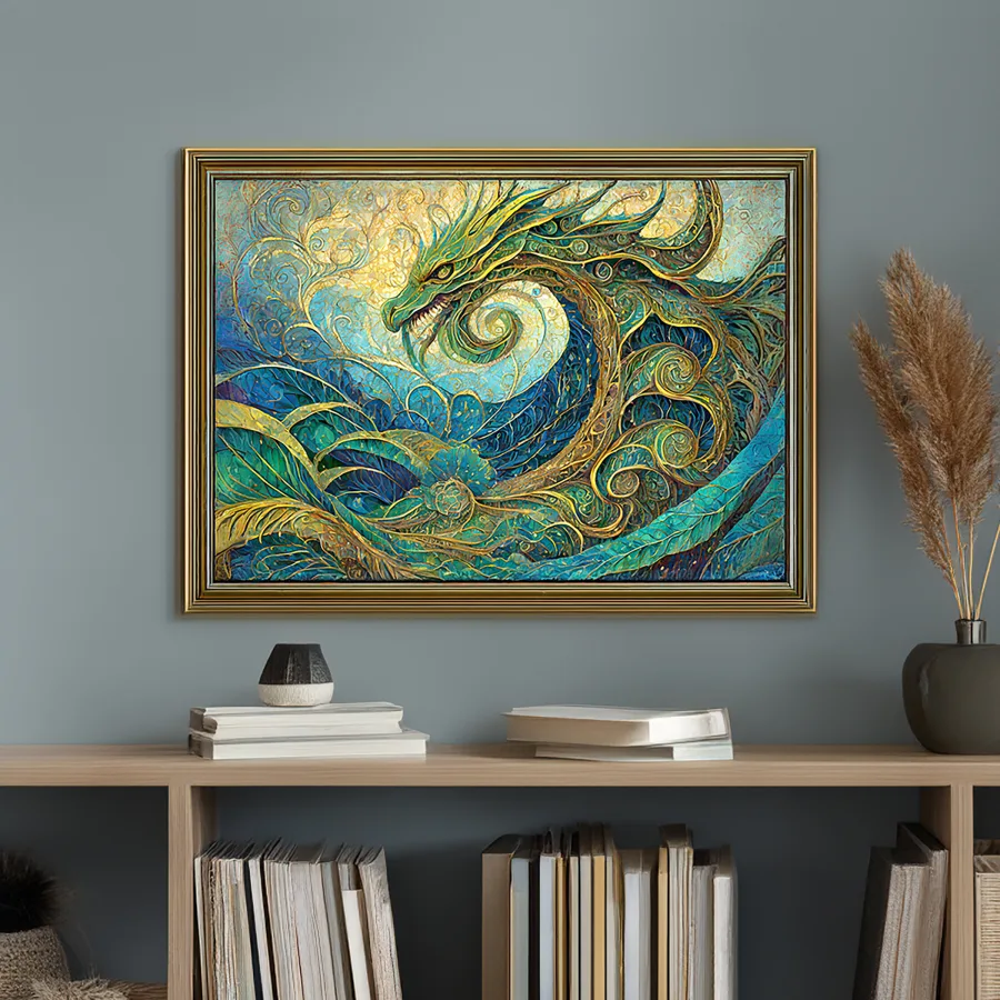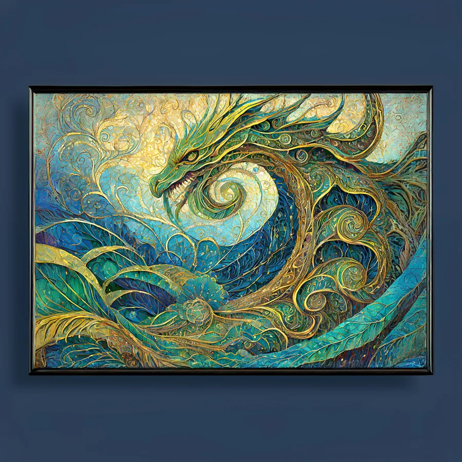 A mesmerizing Eastern dragon writhes through swirling clouds of turquoise and liquid gold, its serpentine form creating hypnotic spirals that seem to pulse with ethereal energy. The aesthetic masterfully blends Studio Ghibli's mystical whimsy with Van Gogh's starry turbulence, creating a texture that looks like someone literally liquified magic and splashed it across the canvas. Look, if you're not already planning to make this the centerpiece of your meditation room while pretending you're a dragon-whispering mystic, I don't even know what to tell you.