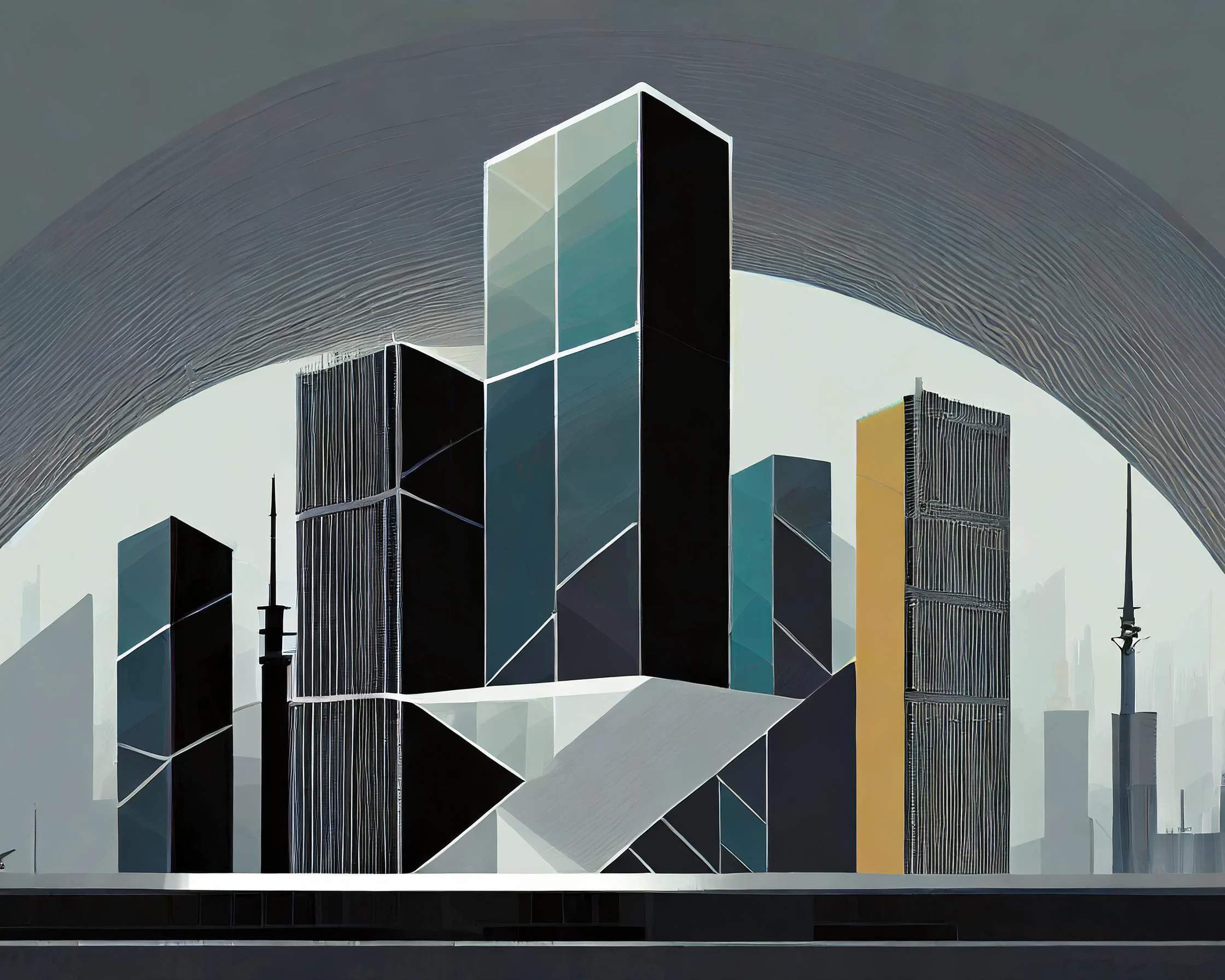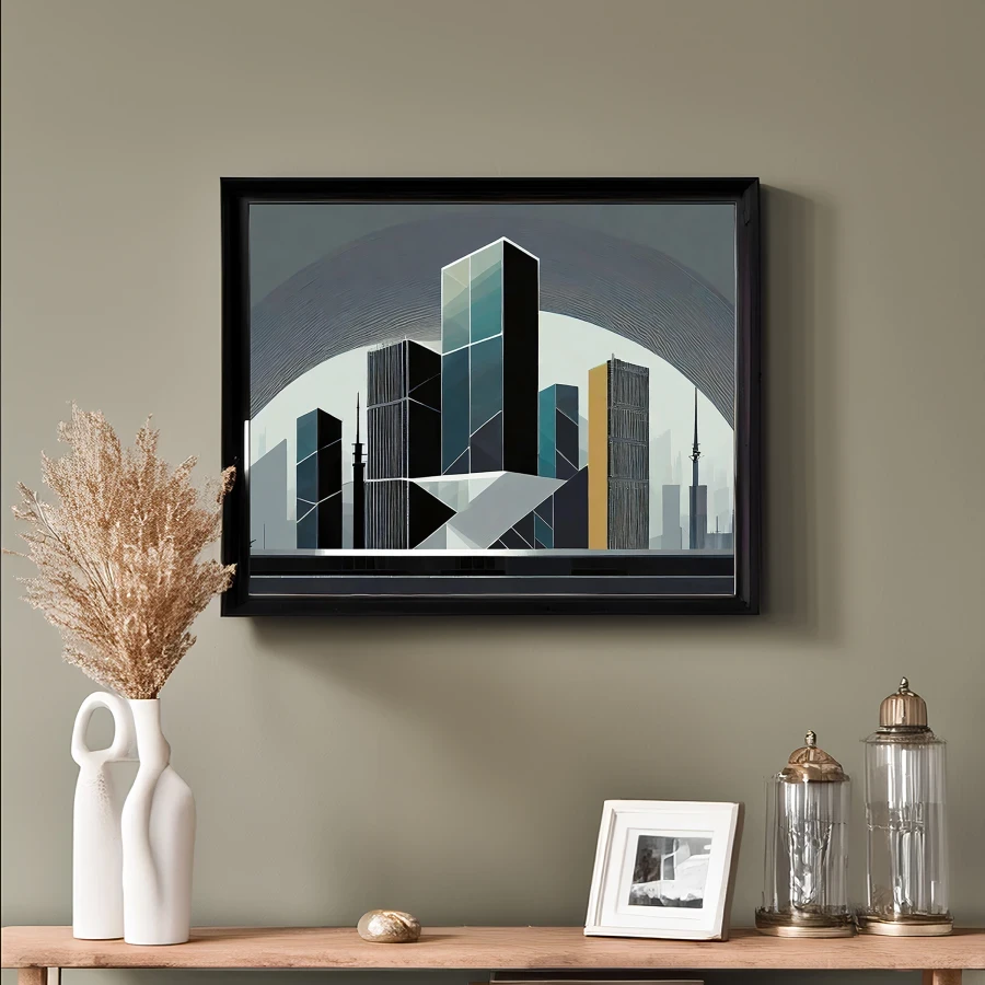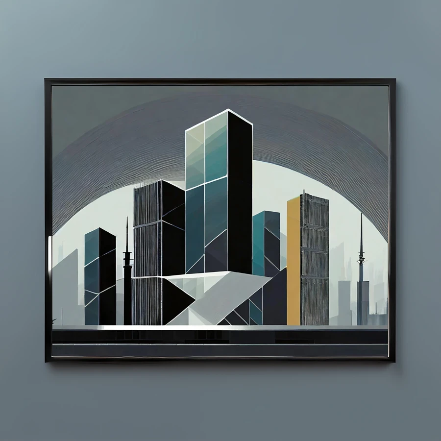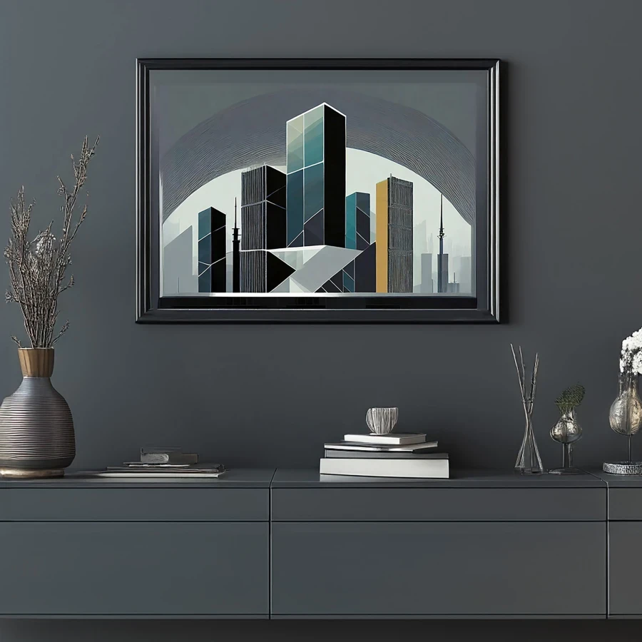 Gleaming obsidian towers slice through a teal-washed sky like crystalline daggers in this ultra-sleek cityscape that screams "corporate overlords are definitely NOT monitoring your thoughts from up there." The piece masterfully blends brutalist architecture with cyberpunk aesthetics, creating a weirdly plausible future where apparently everyone forgot that windows are supposed to actually let you see inside buildings. Listen, if you're not already plotting to overthrow the system while staring at this piece mounted above your ergonomic standing desk, you're honestly doing it wrong.