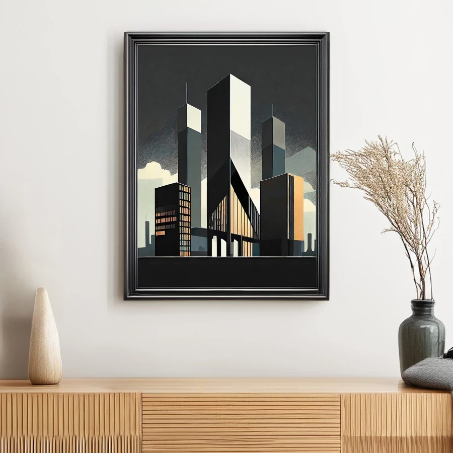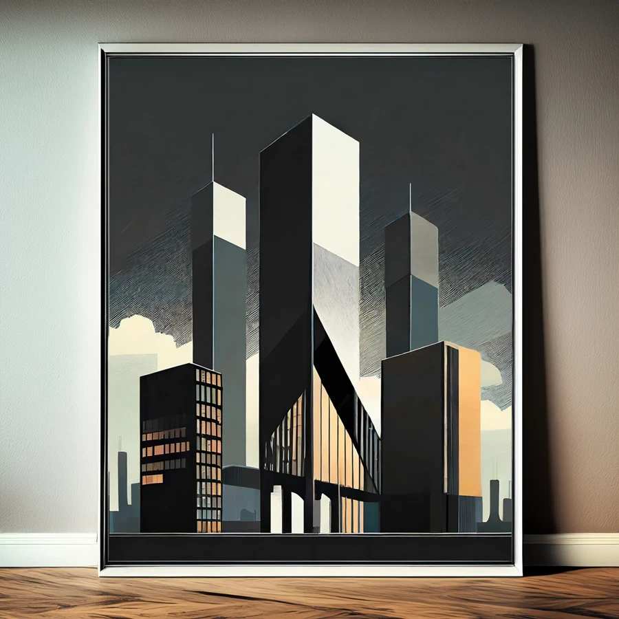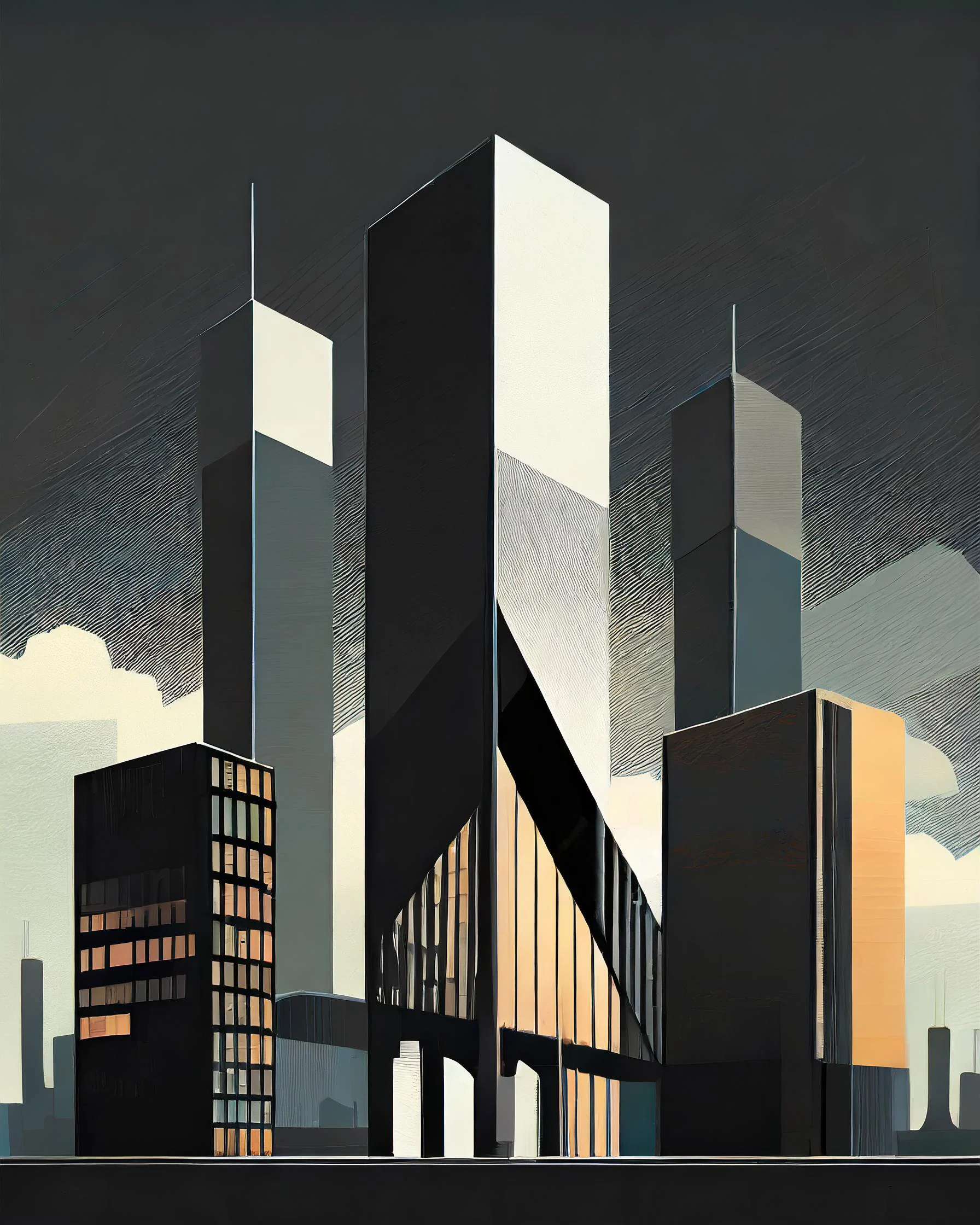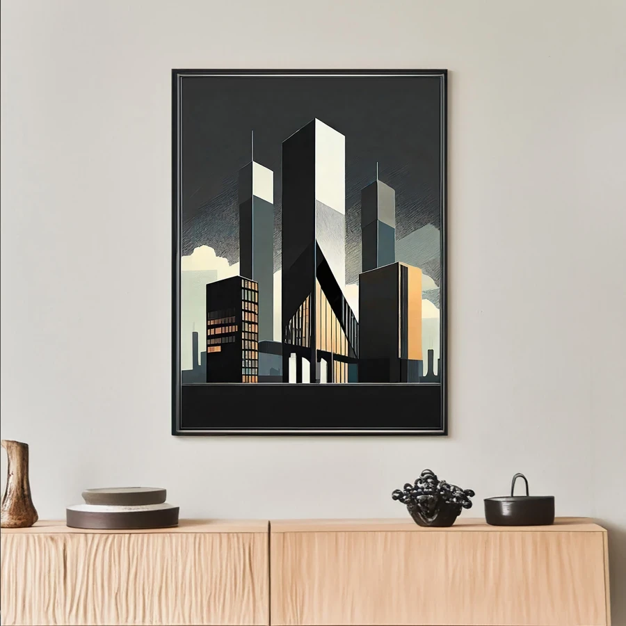 Towering monoliths of raw concrete and steel slice through the dawn sky like ancient geometric gods awakening from their slumber. The stark minimalist forms channel pure brutalist energy, creating a moody architectural fever dream where Art Deco meets dystopian tech aesthetic in an oddly satisfying way. Perfect for that corner office where you're plotting world domination, or just pretending to during your 3 PM Zoom calls.