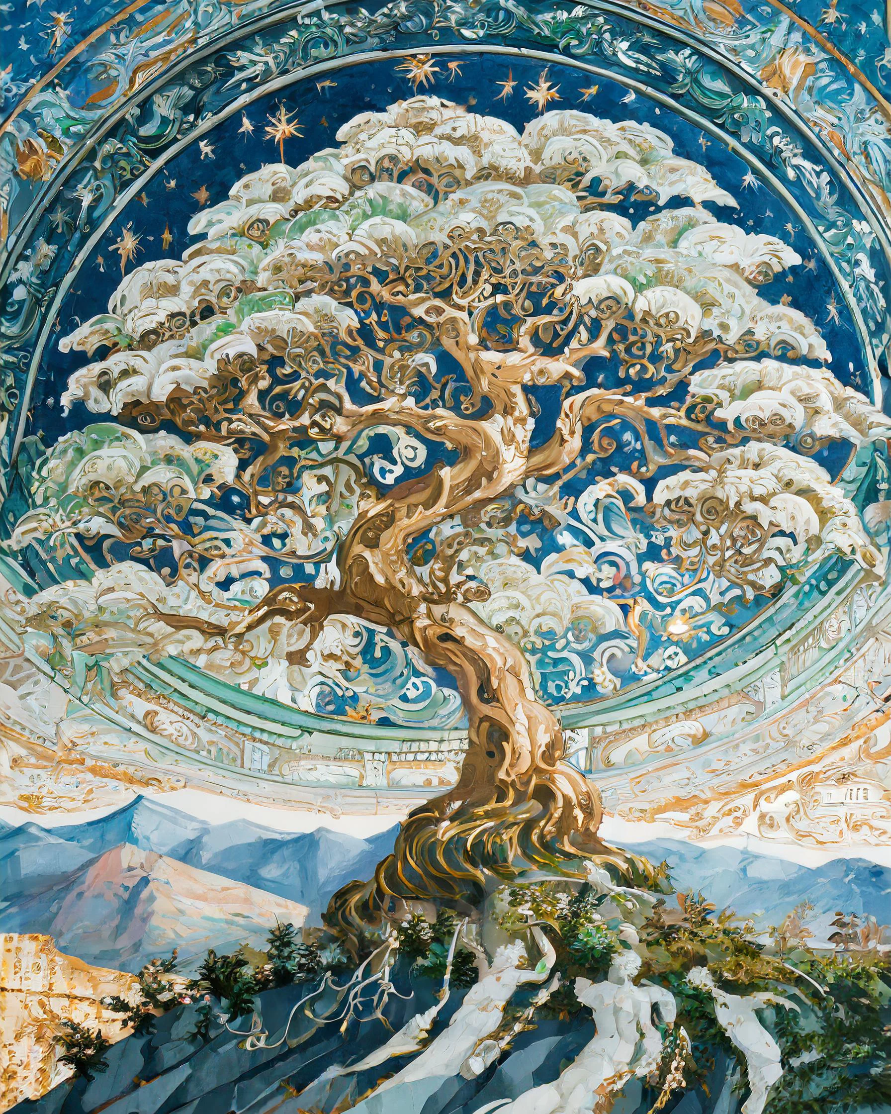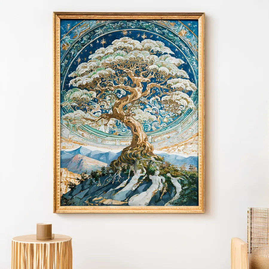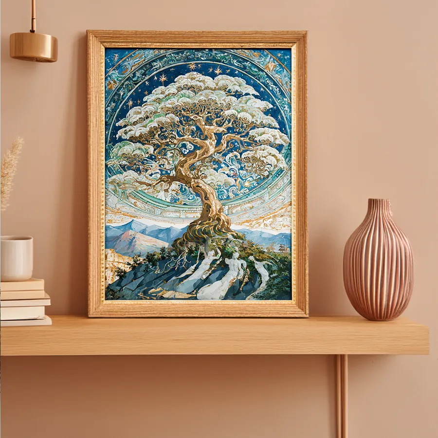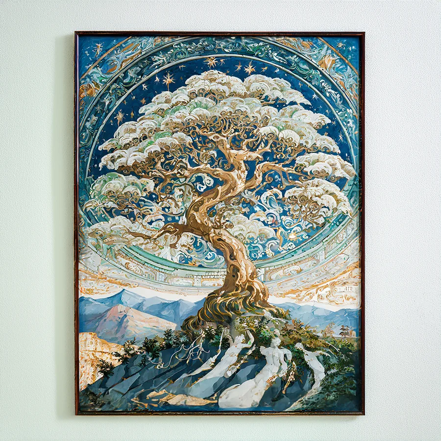 A gnarled, luminous tree reaches its twisted branches toward an impossibly starlit sky, each limb seeming to dance with its own inner light against a cosmic swirl of celestial energy. The piece marries Studio Ghibli's enchanted whimsy with Van Gogh's emotional brushwork, creating an ethereal landscape where sacred geometry meets wild, untamed nature. Perfect for that meditation room where you pretend to find inner peace but actually scroll through TikTok while lying on your yoga mat.