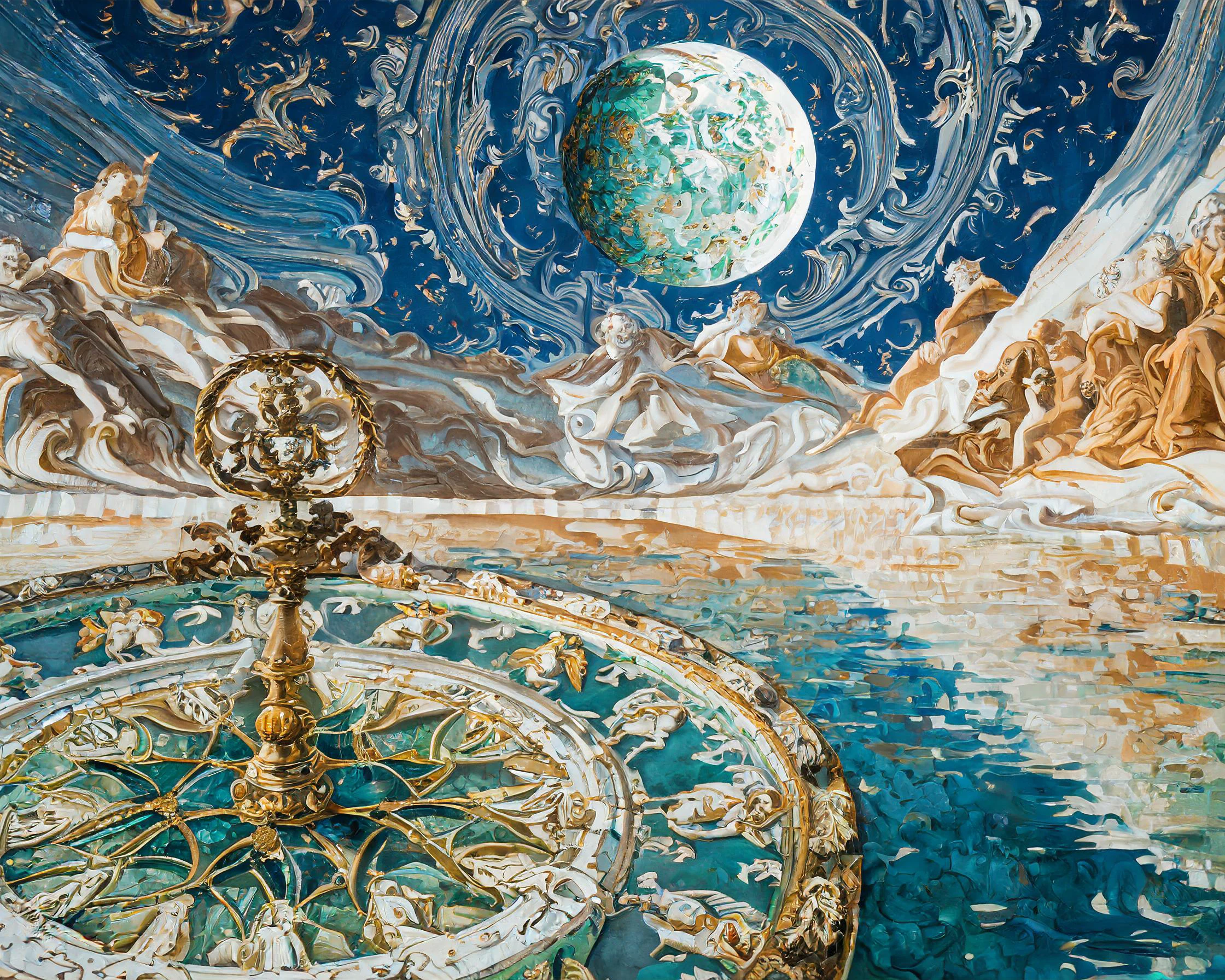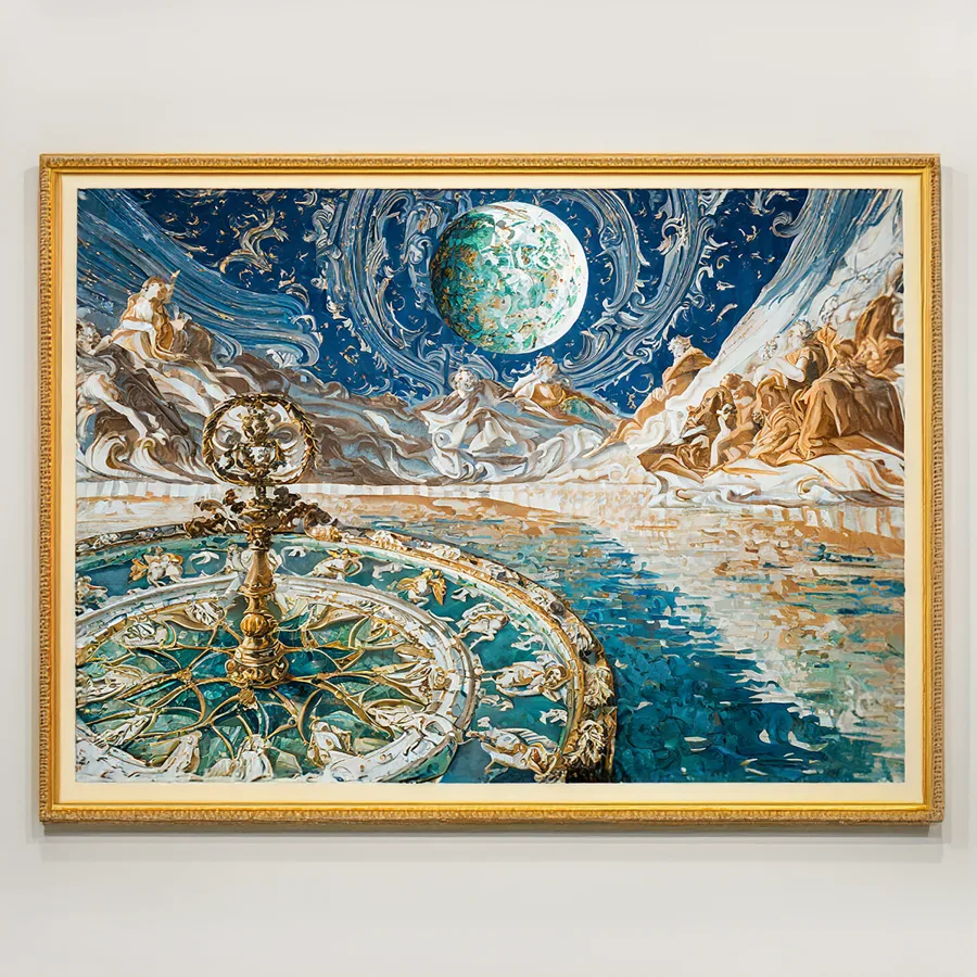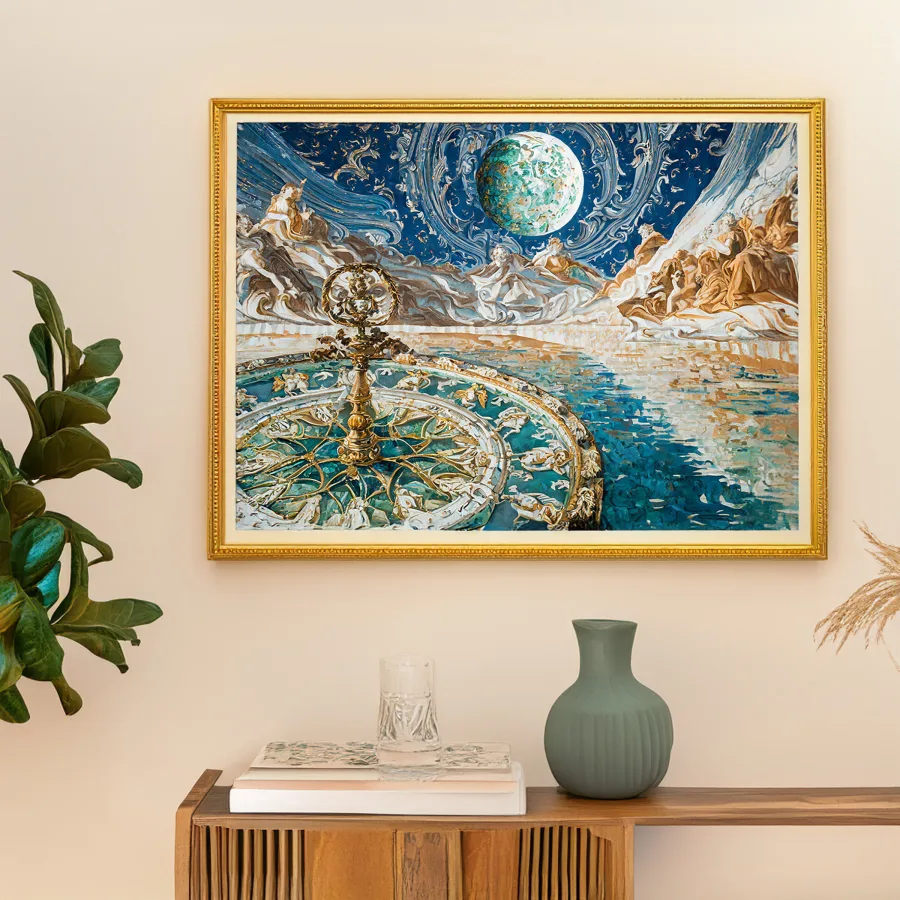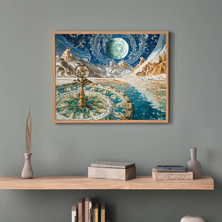 A mesmerizing golden compass emerges from swirling turquoise moonlight, its ornate baroque details practically spinning with their own celestial energy. This mind-bending fusion of Renaissance craftsmanship and sci-fi fantasy creates a Van Gogh-meets-steampunk fever dream that'll have you questioning which century it's from. Perfect for when you want your meditation room to scream "I'm a time-traveling space witch who knows exactly where she's going" (even if you totally don't).