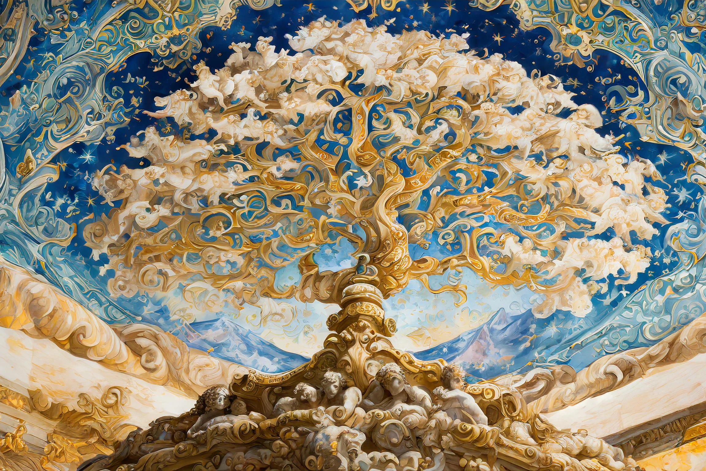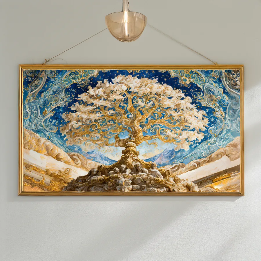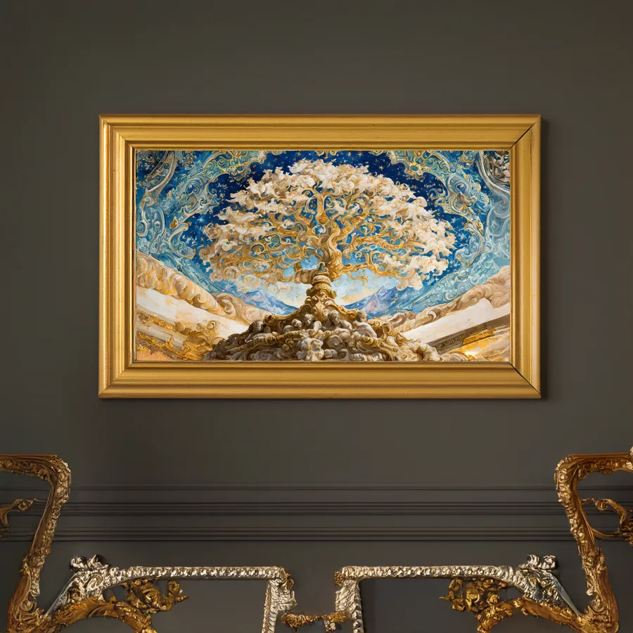 Swirling golden clouds part like celestial curtains as cherubs and angels dance through an impossibly vast baroque ceiling that makes you question if you're still on Earth or have somehow floated into heaven itself. The masterful blend of rich ultramarine blues and warm metallic golds creates a dreamy Renaissance-meets-fantasy atmosphere that practically drips with old-world luxury and divine inspiration. Listen, if you're not lying on the floor right now taking dramatic selfies while pretending to be a wealthy 18th-century aristocrat having a spiritual awakening, you're honestly doing it wrong.