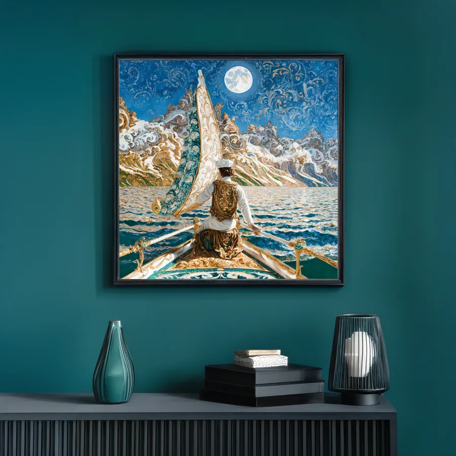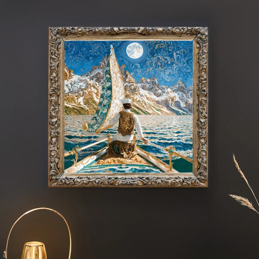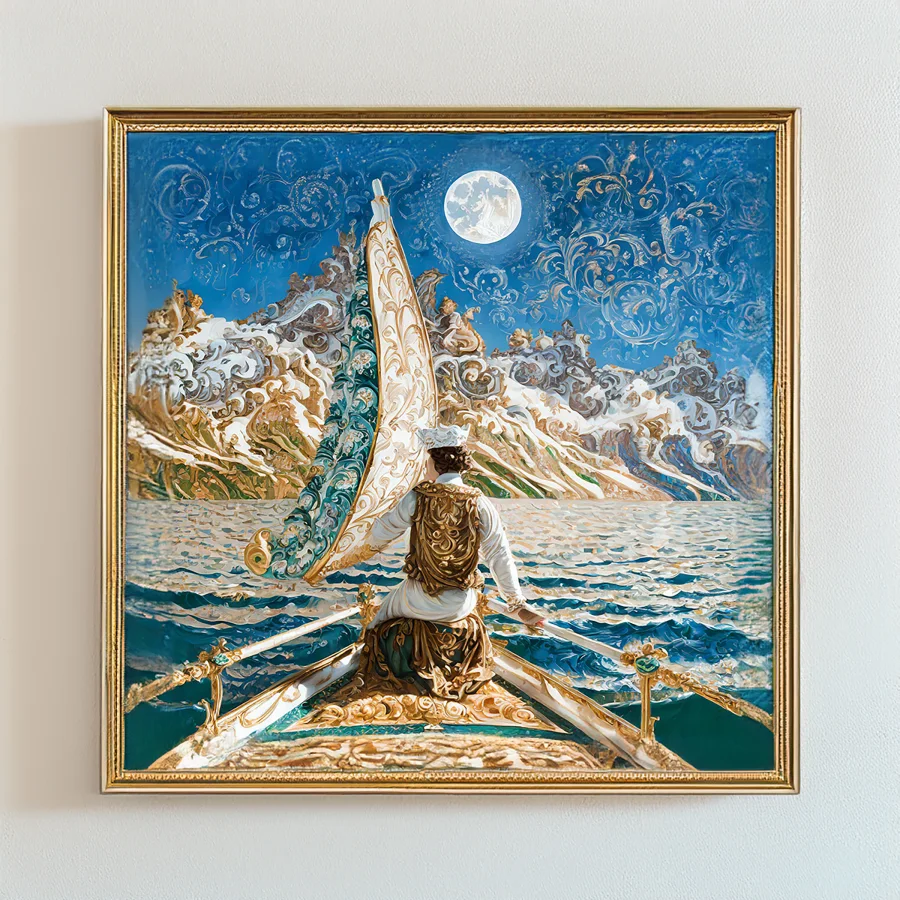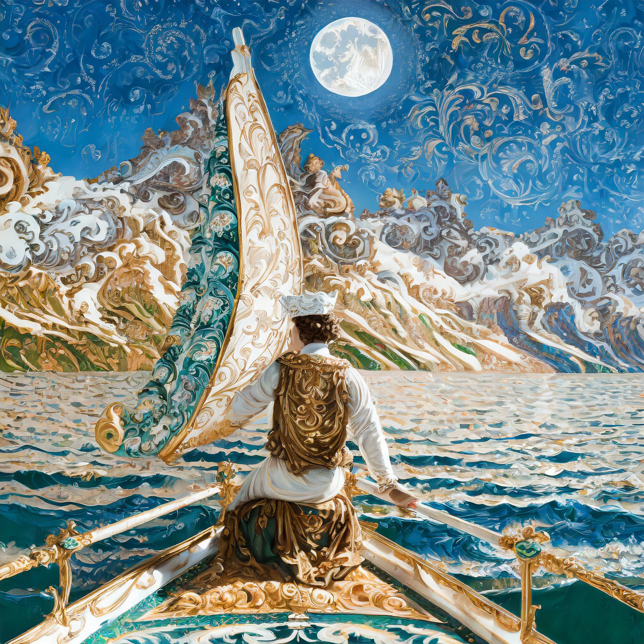 A magnificent galleon glides through swirling, Van Gogh-esque clouds that spiral around an impossibly large golden moon. The painting masterfully blends baroque maritime detail with pure fantasy whimsy, featuring ornate rococo waves trimmed in gilt and sails that seem to be woven from actual starlight. Listen, if you're not immediately imagining yourself as a slightly unhinged ship's captain who exclusively navigates by consulting mermaids and reading tea leaves, I don't know what to tell you.