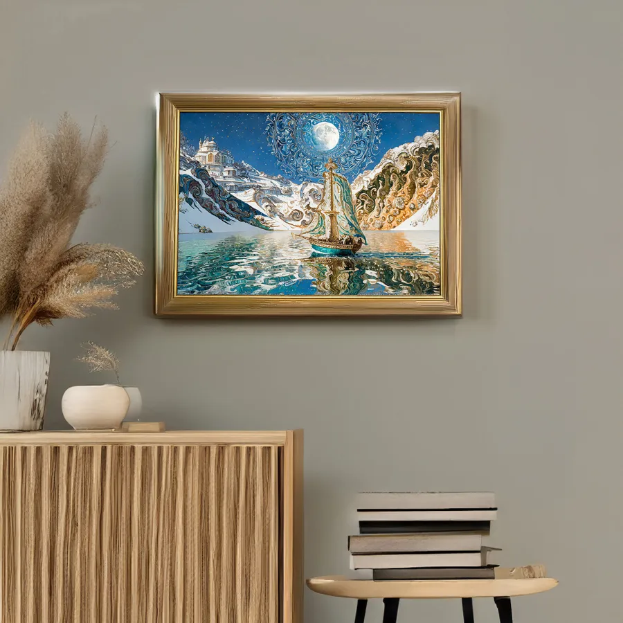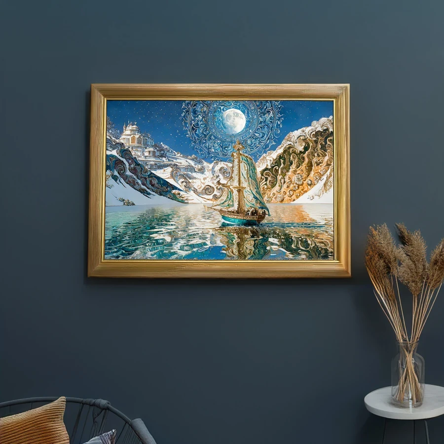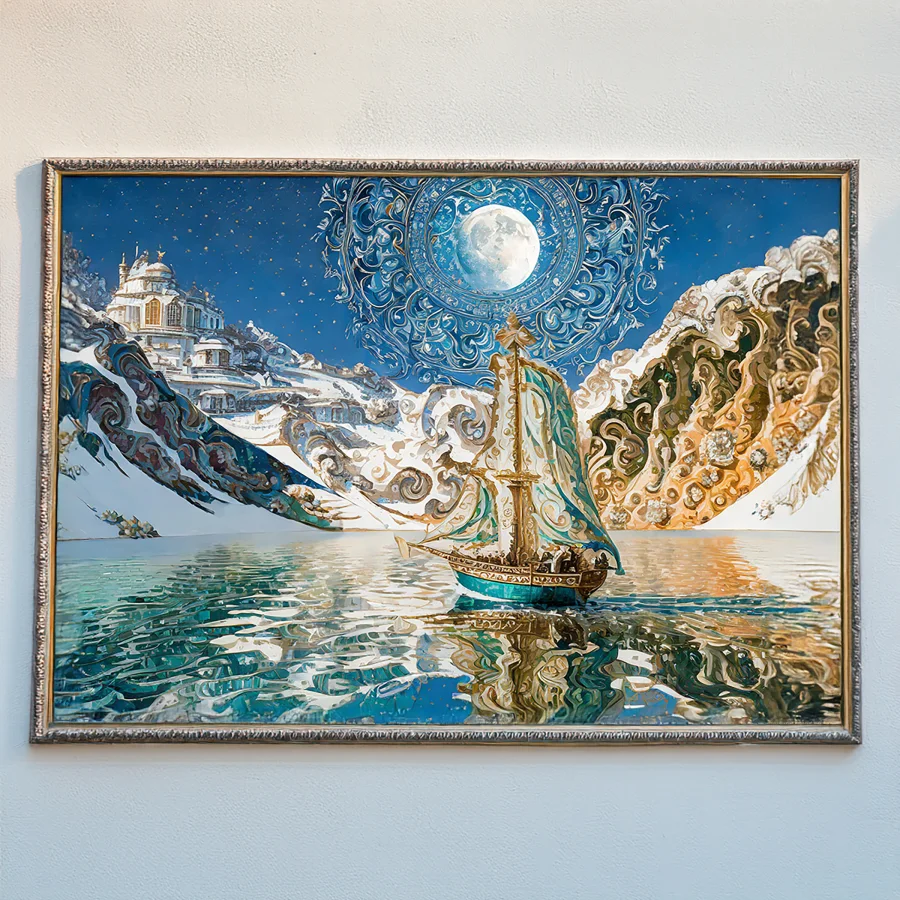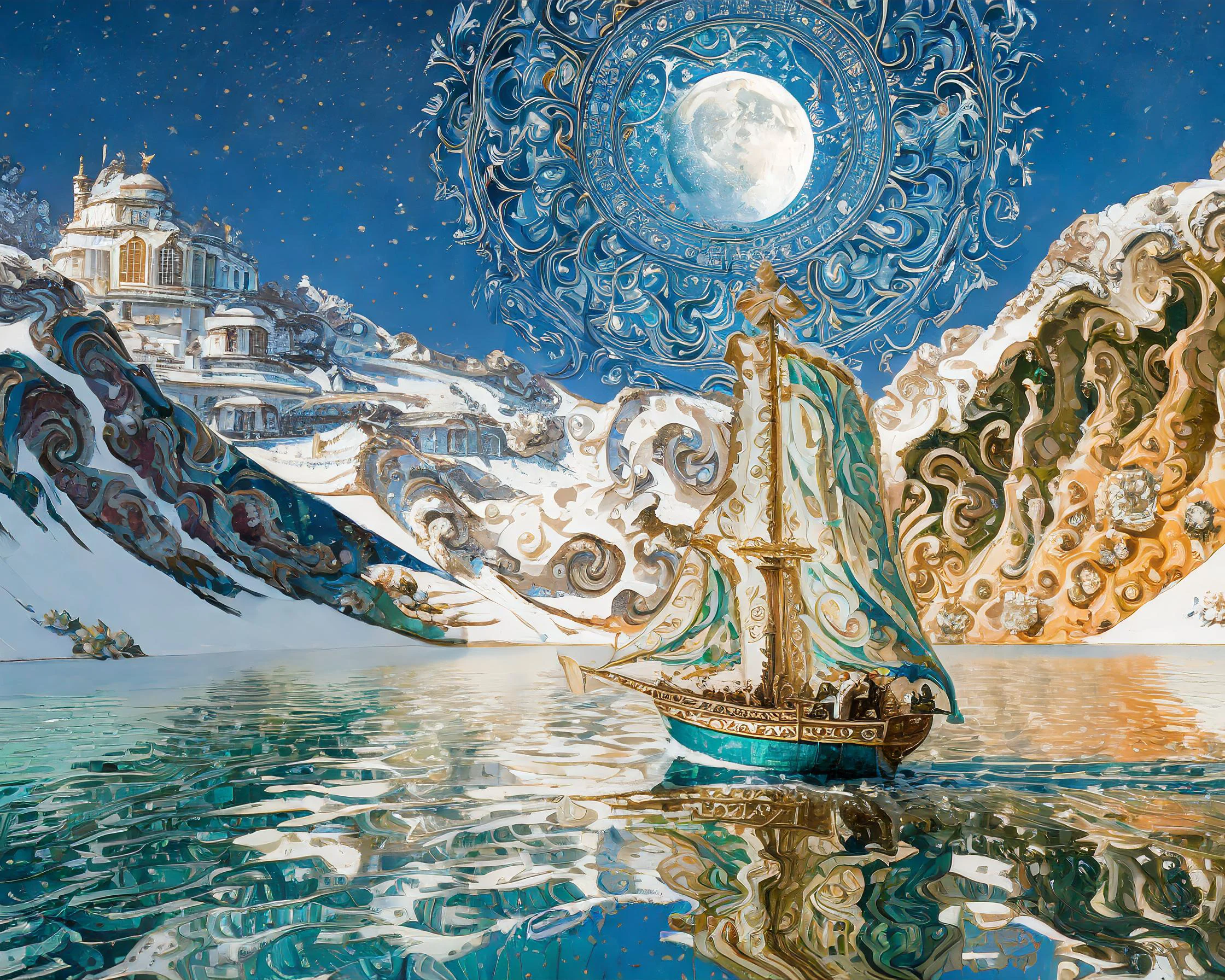 A resplendent sailing vessel glides beneath a baroque moon that seems to dance and pulse with its own ethereal heartbeat, casting impossible reflections across waters that ripple like liquid gold and turquoise glass. Swirling Van Gogh-inspired brushstrokes transform the fantasy landscape into a fever dream of winter wonderland meets nautical fairytale, where every spiral and whorl tells its own story of magic and possibility. Listen, if you don't immediately make this your phone background and pretend you're about to embark on some grand adventure to a faraway mountain castle, we probably can't be friends.