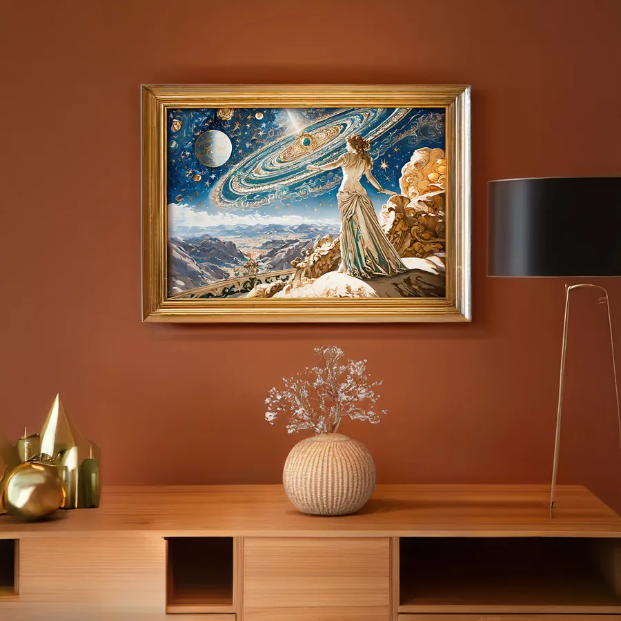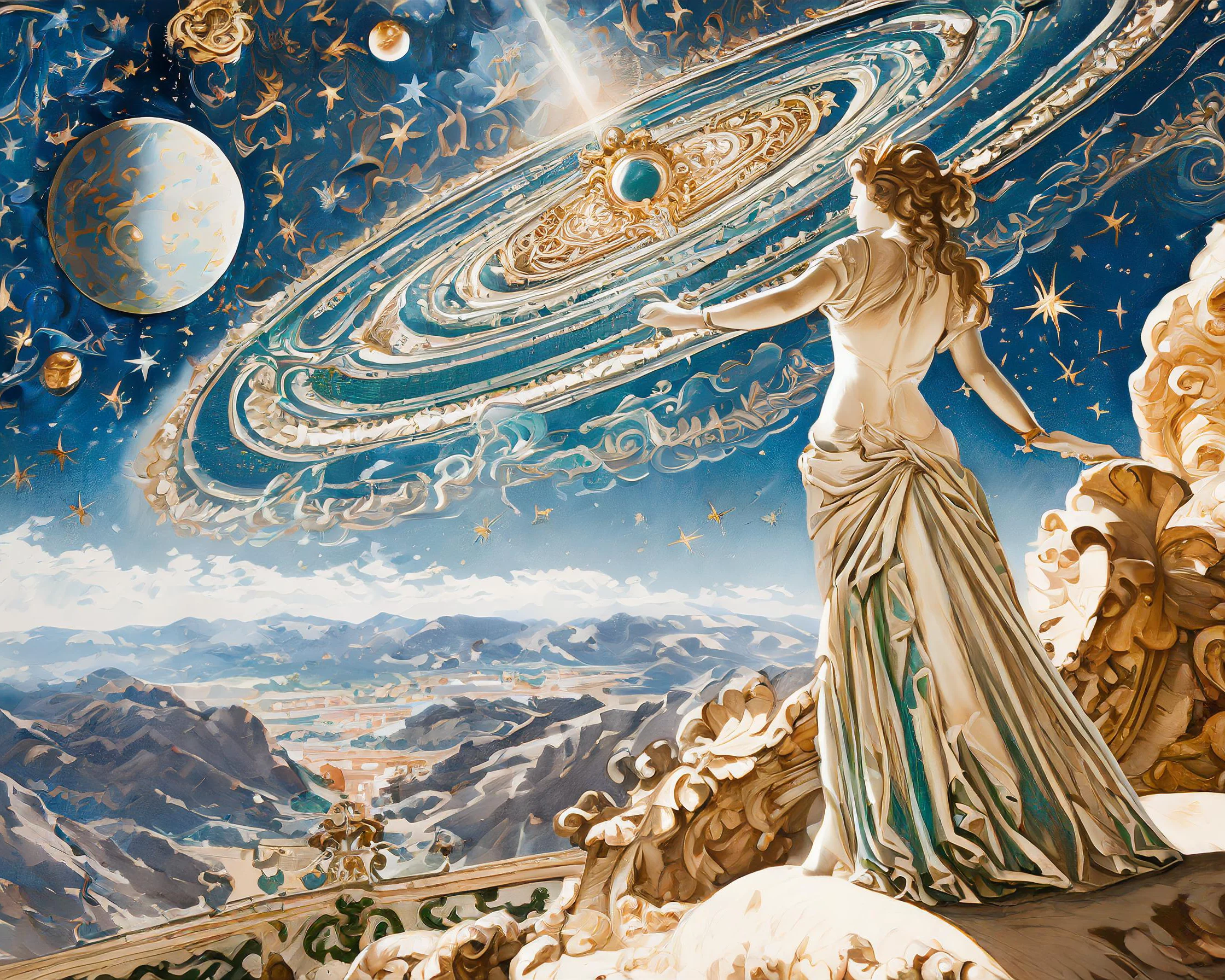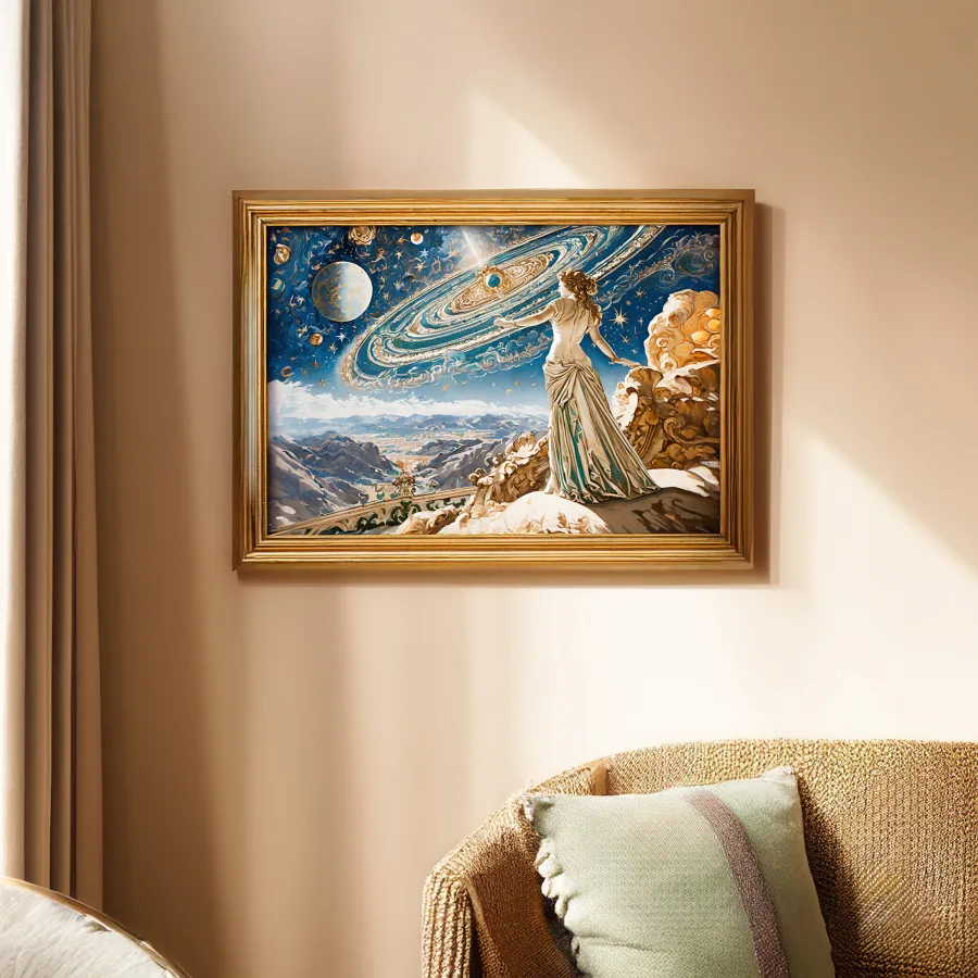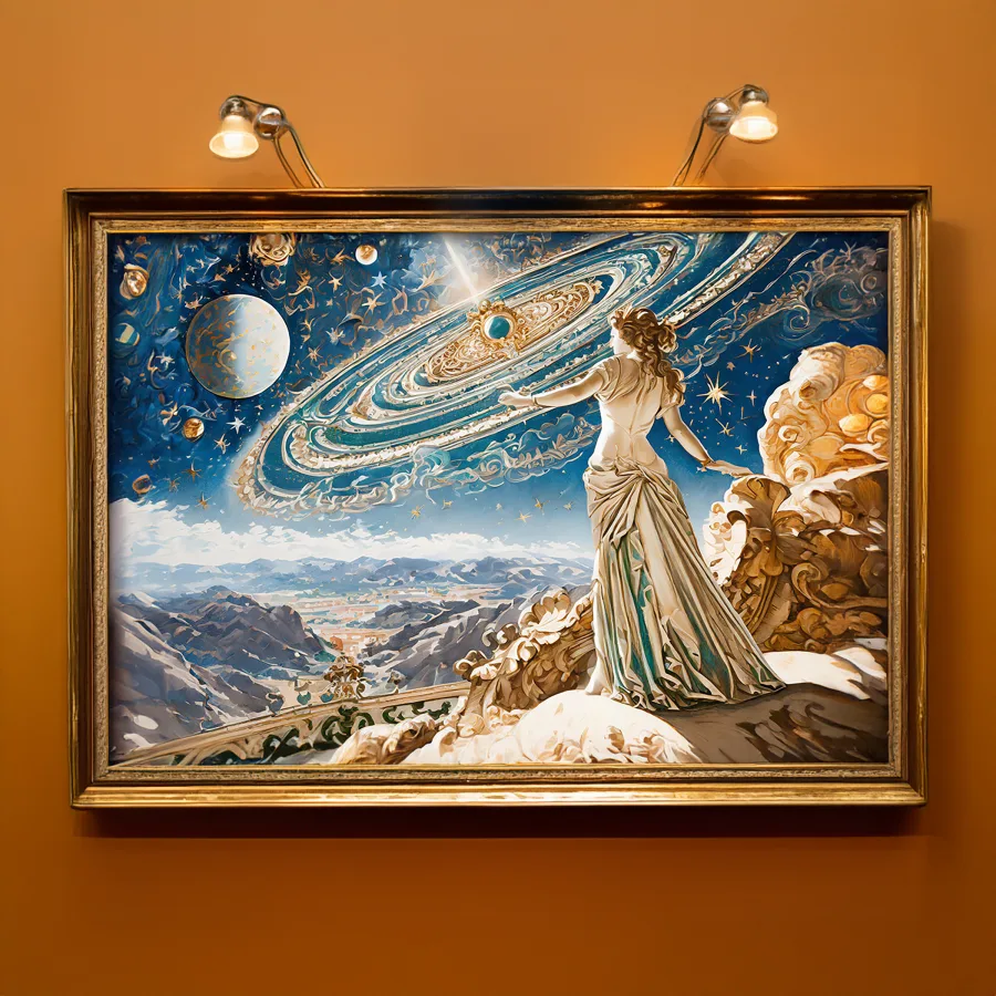 The ethereal figure's sweeping baroque gown explodes into a swirling nebula of blues and purples, creating a cosmic train that stretches across the starlit canvas. This breathtaking fusion of classical Renaissance portraiture and deep-space imagery manages to make the entire Milky Way look like it's serving celestial couture realness. Look, if you're not immediately making this your phone background while dramatically declaring yourself Supreme Ruler of the Cosmic Court, we simply cannot be friends.