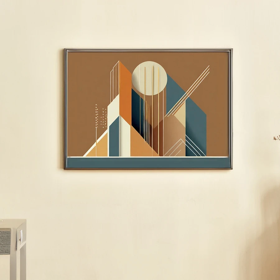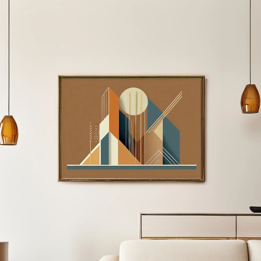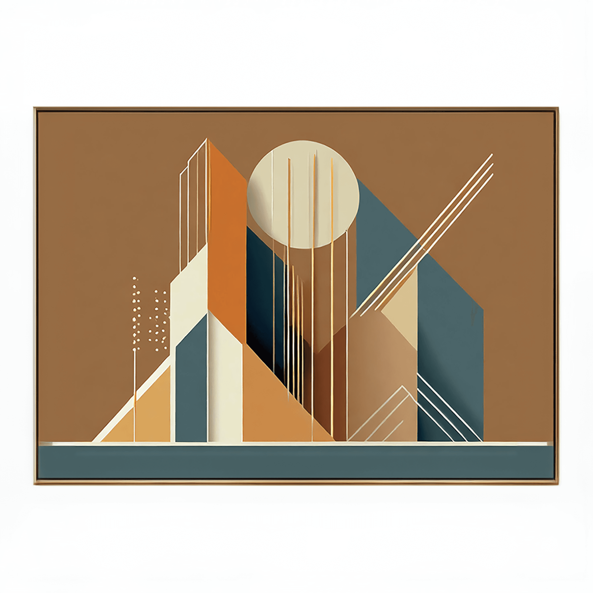 Bold geometric shapes slice through the canvas like a knife through butter, creating an impossible architectural dreamscape where Art Deco skyscrapers pierce a desert moon. The composition masterfully channels both Bauhaus minimalism and retro futurism, with earth-toned polygons stacked in a way that somehow makes math look sexy. Look, if you're trying to convince people you're a sophisticated modernist who totally gets abstract art, this piece screaming "I have my life together" is definitely the flex you need for your living room.