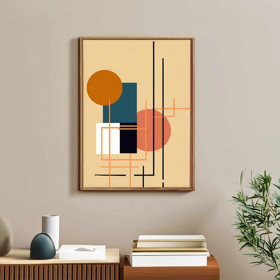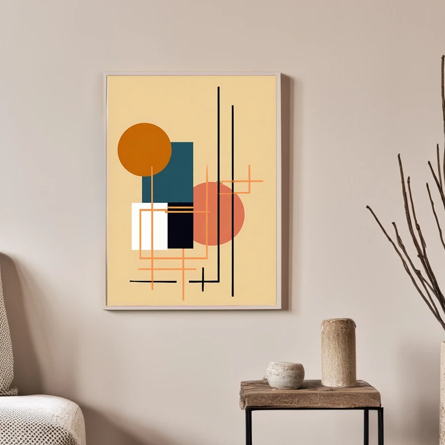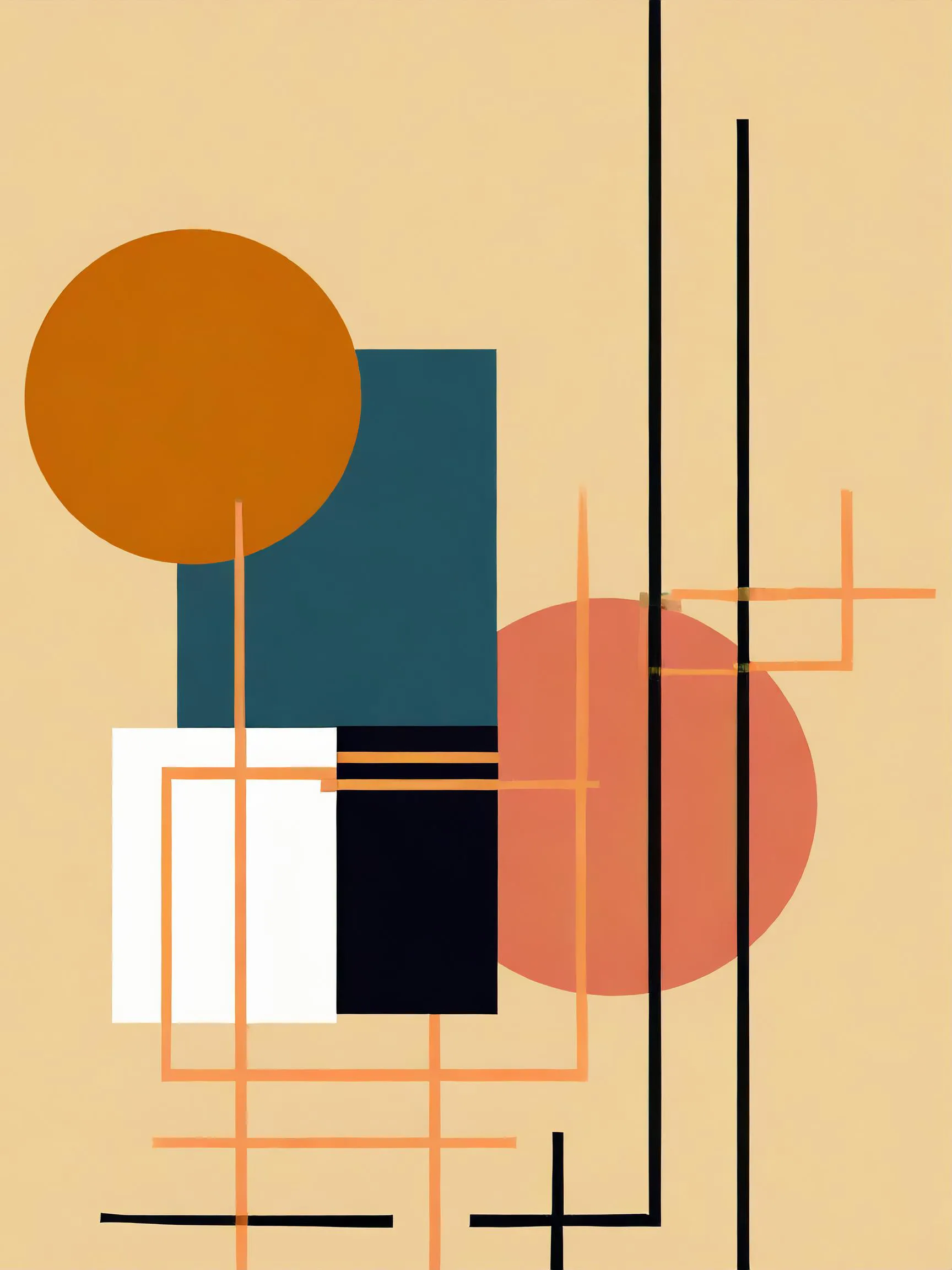 Bold circles and squares dance across the canvas in a mesmerizing game of geometric tag, with orange and teal playing the starring roles in this retro fever dream. The piece channels pure Bauhaus energy through its clean Scandinavian lines and mathematically satisfying composition, like if Mondrian had designed album covers in 1962. Let's be real - this is totally the kind of art that makes you feel sophisticated while waiting for your $7 oat milk latte in that new minimalist coffee shop downtown.