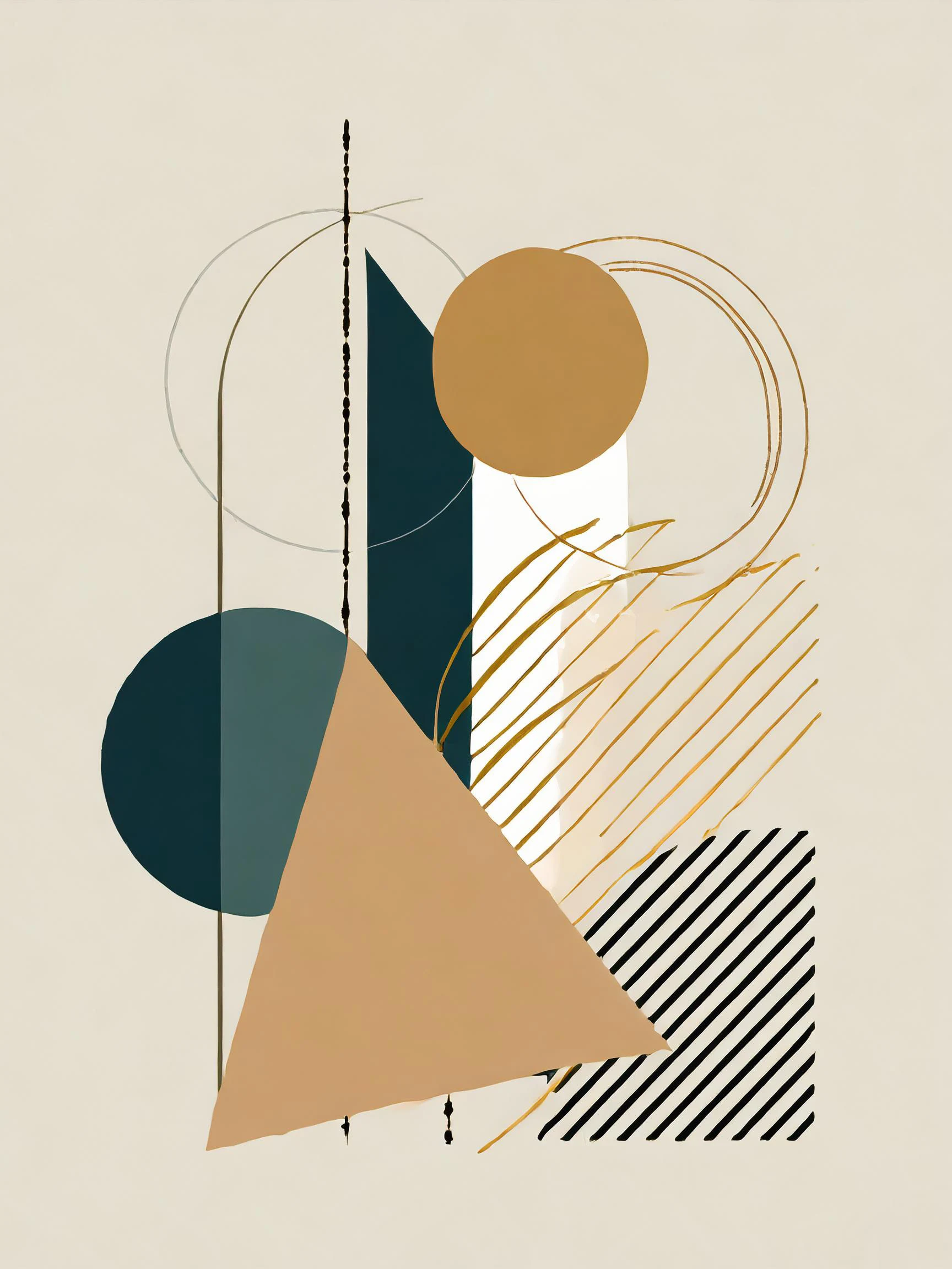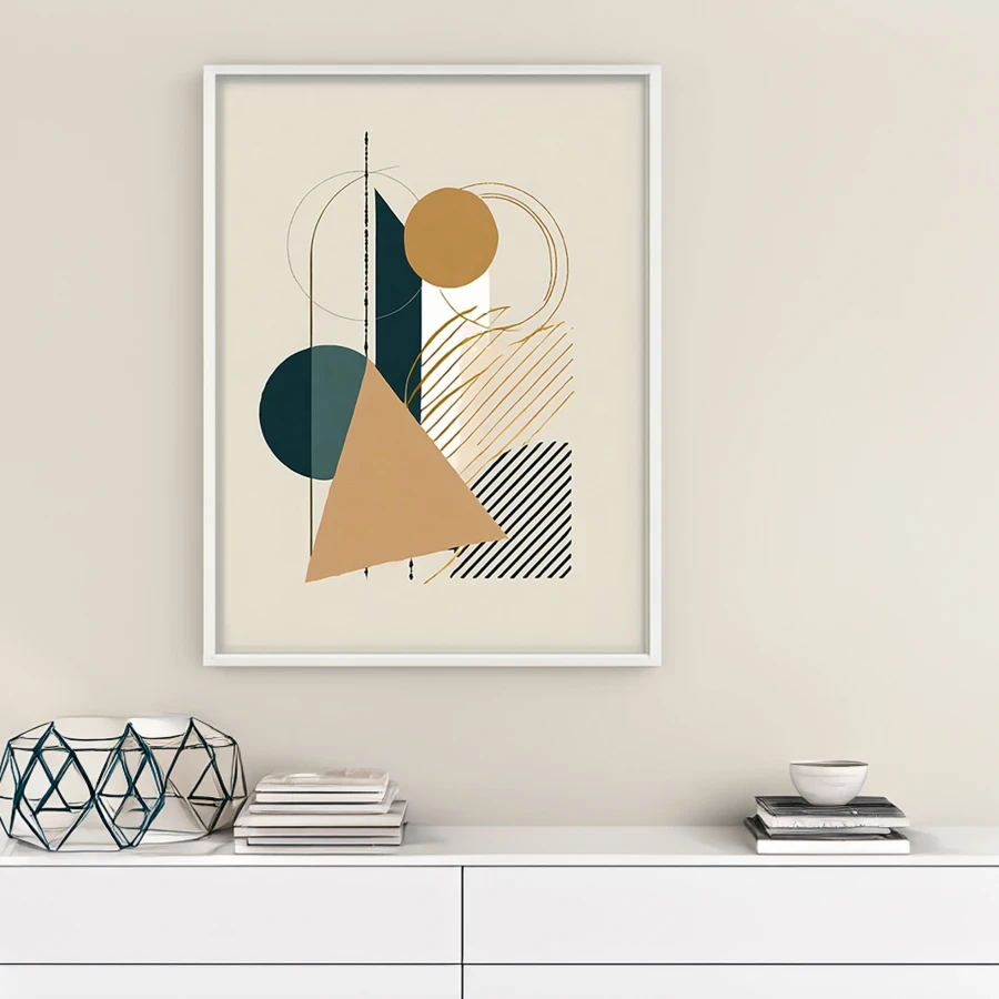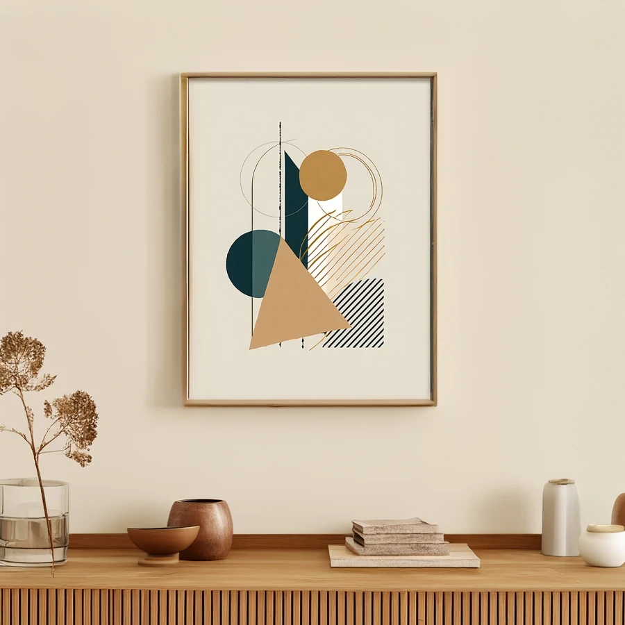 Sleek teal and gold geometric forms float across the canvas like expensive jewelry scattered by a careless billionaire at the end of a very luxurious day. This sophisticated piece channels pure Bauhaus energy through its masterful balance of minimalist shapes and Scandinavian-inspired color palette, creating the kind of high-end zen that makes you feel like you've got your life together even when you definitely don't. Listen bestie, if you want your space to whisper "I have an actual interior designer and read books about architecture for fun," this is totally the vibe you need.