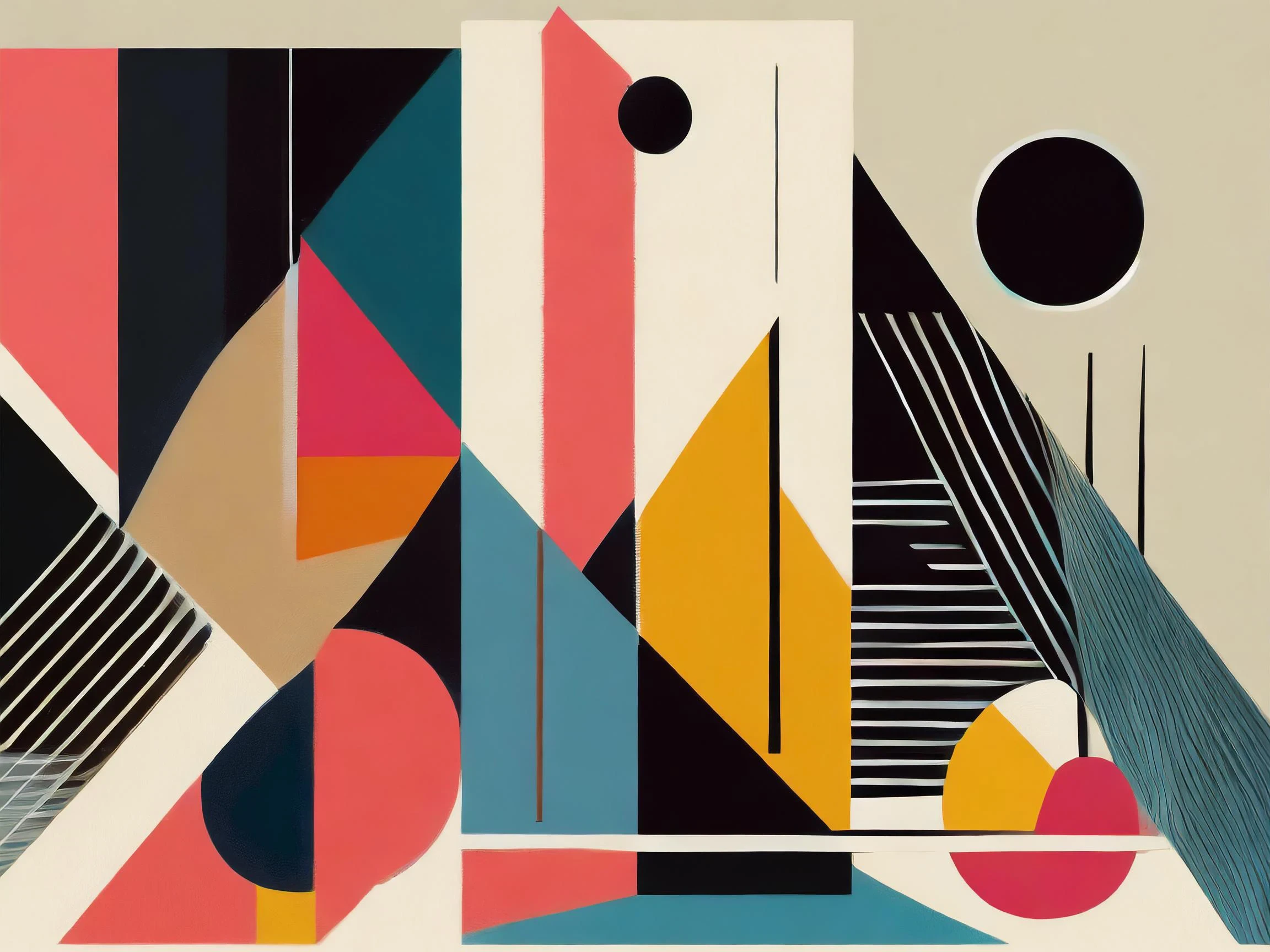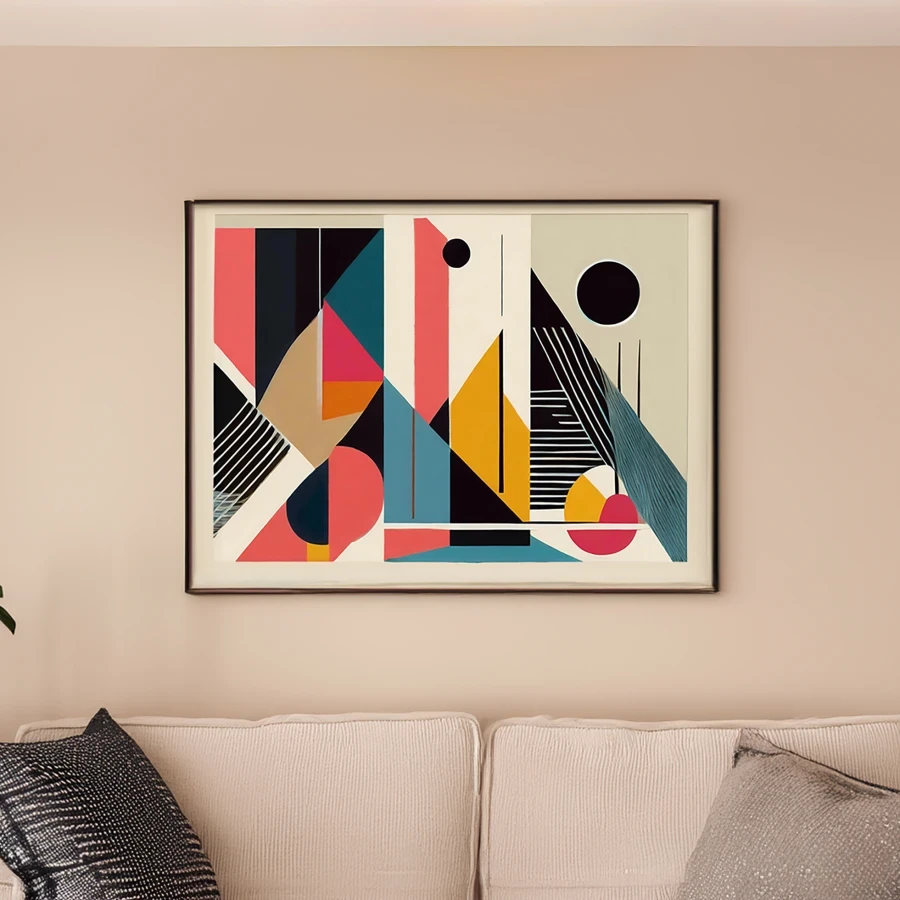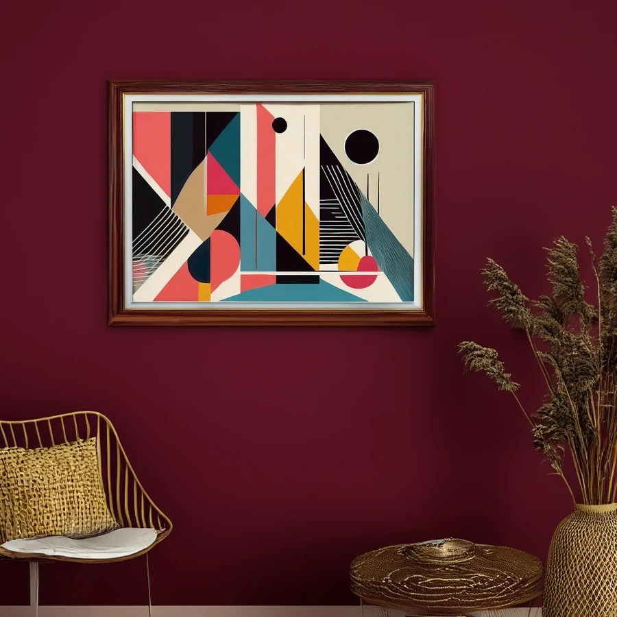 These razor-sharp geometric forms in bold coral and teal slice through space like a hypnotic fever dream of architectural perfection. The piece masterfully channels Bauhaus principles through a retro-futuristic lens, where crisp lines and circular elements dance in an almost mathematically satisfying display of mid-century minimalism. Listen, if this doesn't make you want to redesign your entire personality around owning this print while drinking an oat milk latte in your embarrassingly bare "modern creative" apartment, I don't know what will.