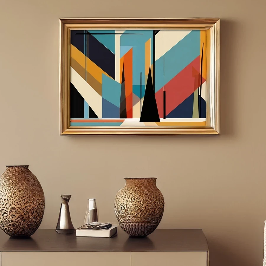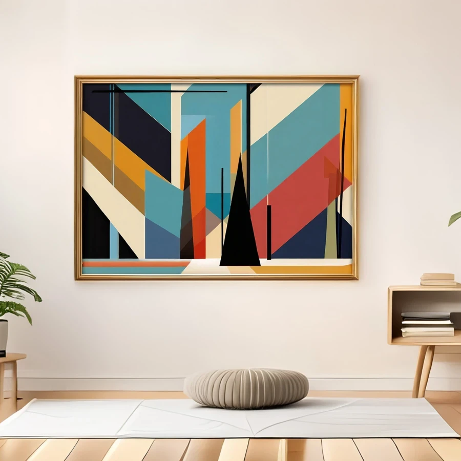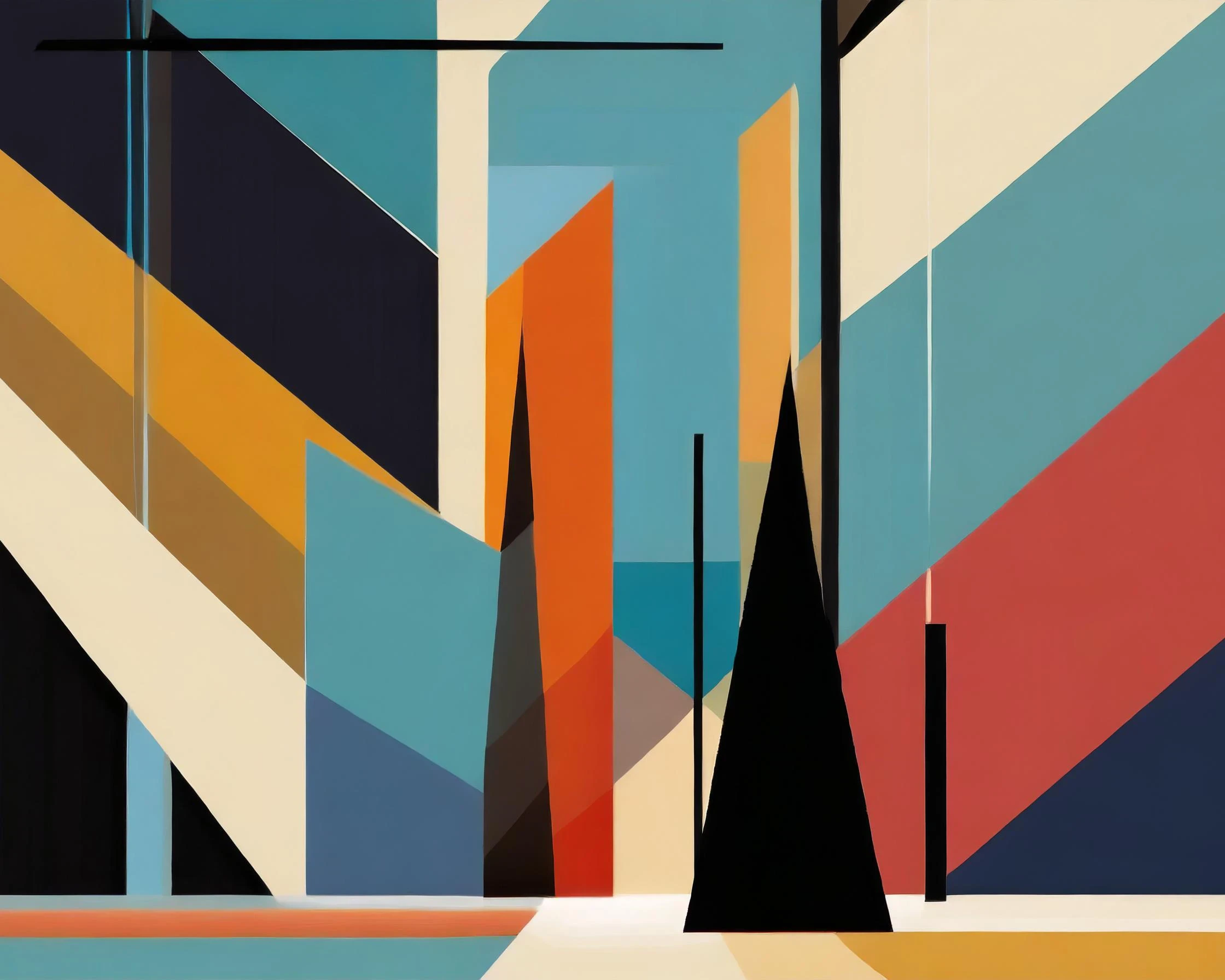 Bold geometric forms slice through the composition like a knife through butter, creating a mesmerizing dance of angles and negative space that'll make your eyes do backflips. Drawing from both Bauhaus principles and modern tech aesthetics, the piece masterfully balances retro architectural precision with a contemporary color palette that screams "I have my life together" (even if you don't). Look, if you're trying to convince your coworkers you're sophisticated while secretly binging reality TV at home, this is exactly the kind of art you need on your wall.